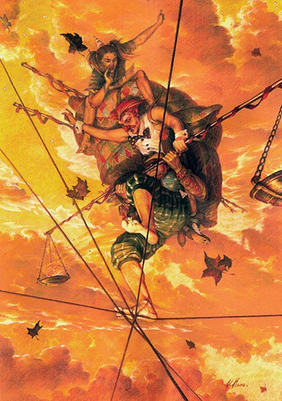 Первая иллюстрация — иллюстрация с Воландом, по замыслу должна была приковывать взгляд, гипнотизировать и вместе с тем подсознательно вызывать ощущение нестабильности у зрителя. Отсюда и её композиция, вписанные в перевёрнутый вершиной вниз треугольник персонажи иллюстрации. Существуют определённые композиционные схемы построения композиций, которые я всегда применяю в своих работах, перевёрнутый треугольник означает отсутствие равновесия.